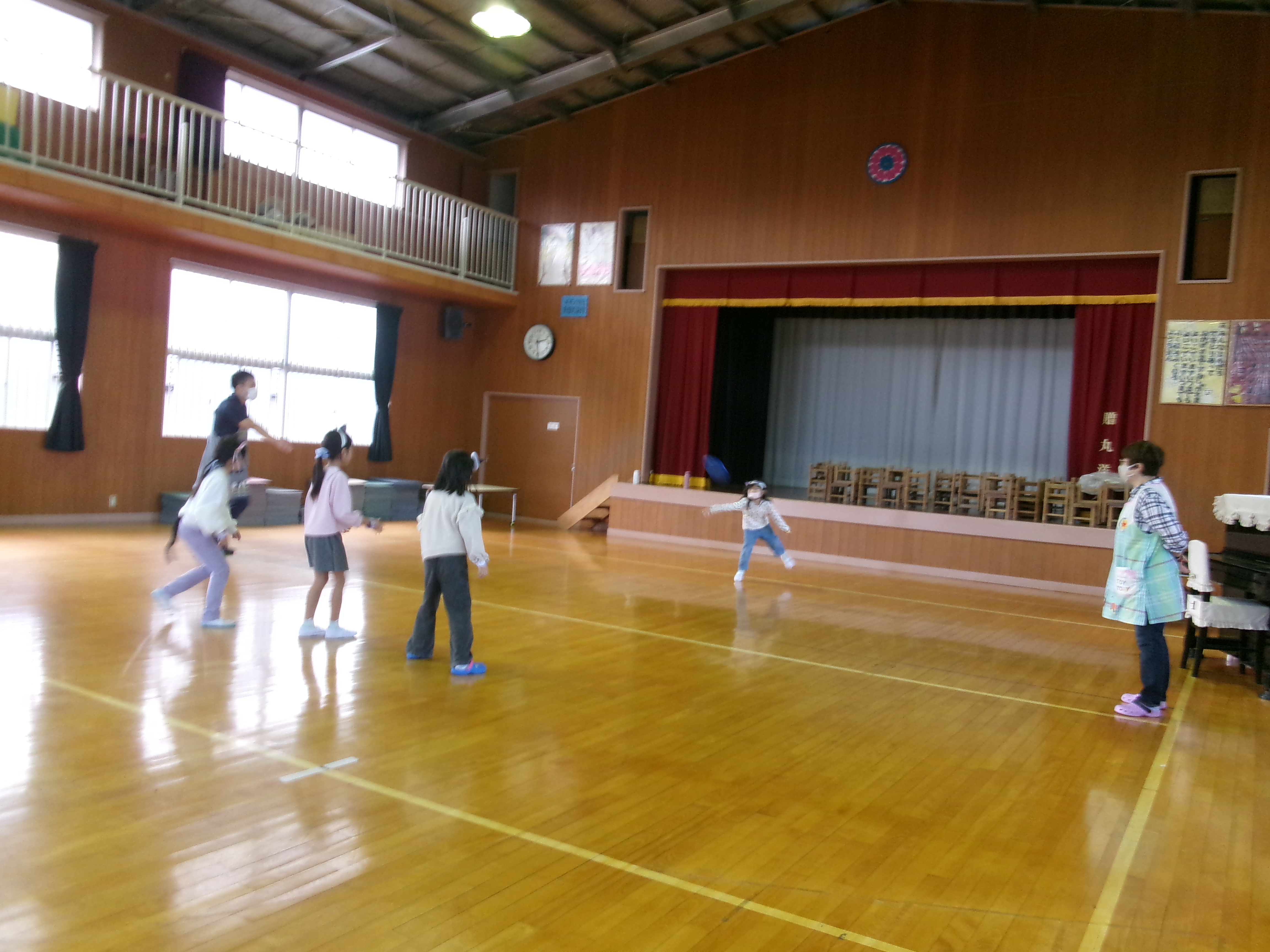 体育館でのゲーム遊びでは、おばけチームとカボチャチームに分かれ
