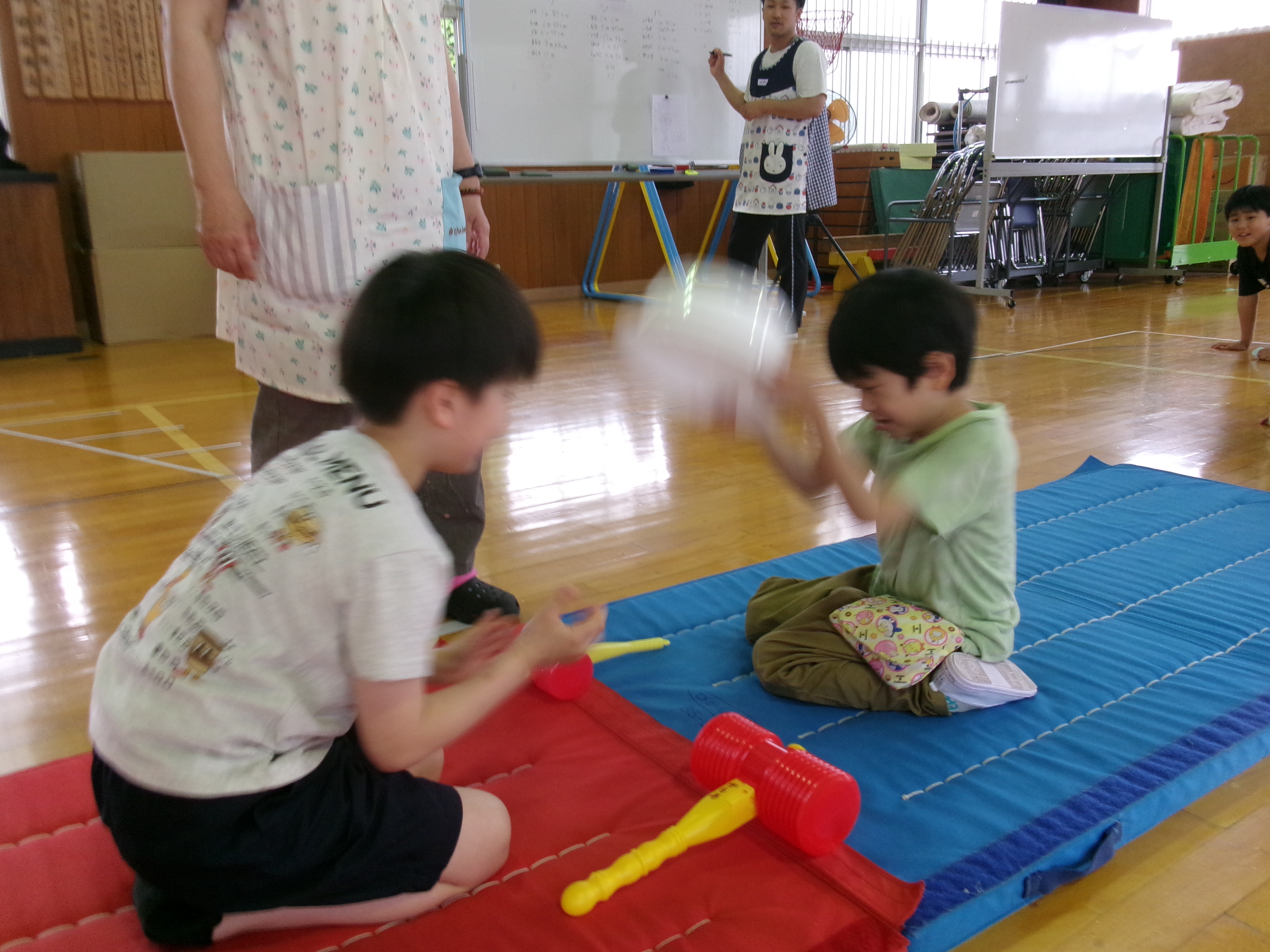 上級生が1回で相手を倒したり、じゃんけんで負けたのにハンマー